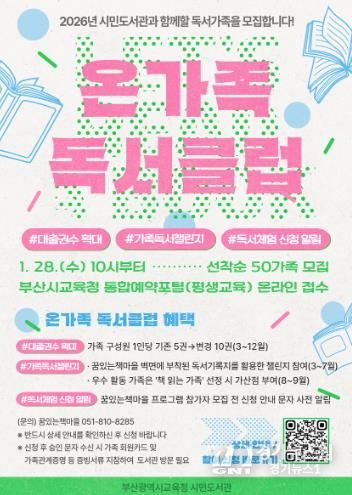[경기뉴스원/경기뉴스1] | 부산광역시립시민도서관은 오는 28일부터 영·유아 및 초등학생 자녀를 둔 가족을 대상으로 ‘온가족 독서클럽’ 참여 가족 50팀을 모집한다.