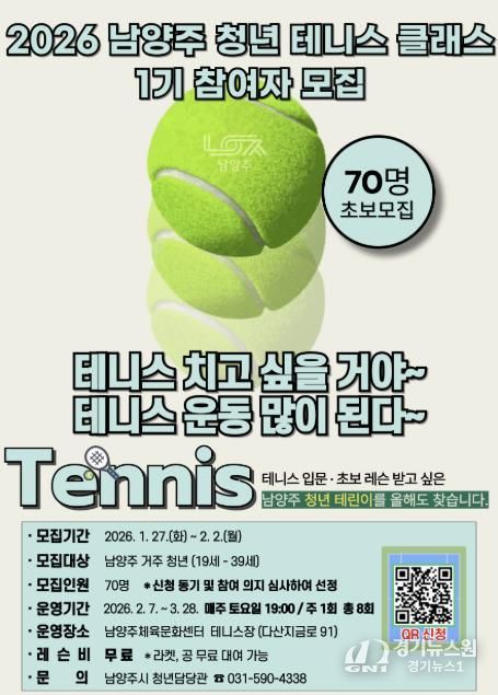[경기뉴스원/경기뉴스1] | 남양주시는 27일부터 내달 2일까지 ‘2026 남양주 청년 테니스 클래스 1기’ 참여자를 모집한다고 밝혔다.