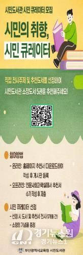 [경기뉴스원/경기뉴스1] | 부산광역시립시민도서관은 오는 3월부터 12월까지 이용자가 직접 도서를 추천하고 전시에 참여하는 북큐레이션 프로그램 ‘시민의 취향, 시민 큐레이터’를 운영한다.