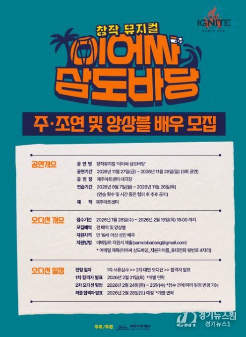 [경기뉴스원/경기뉴스1] | 제주아트센터는 올해 11월 개최 예정인 창작뮤지컬 ‘이어싸 삼도바당’에 참여할 배우를 모집하고, 공연 오디션을 진행한다.