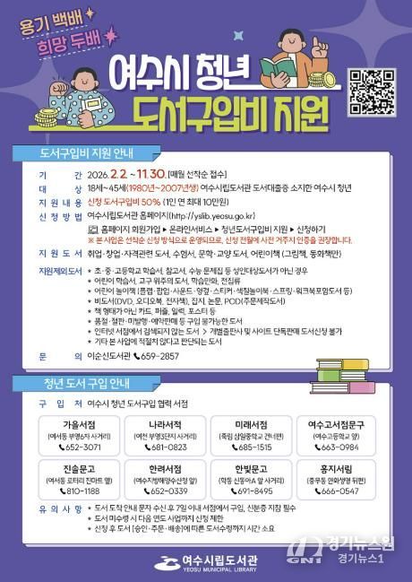 [경기뉴스원/경기뉴스1] | 여수시는 오는 2월 2일부터 여수시에 거주하는 18~45세(1980~2007년생) 청년을 대상으로 도서구입비의 50%를 지원하는 ‘청년 도서구입비 지원사업’을 본격 추진한다.