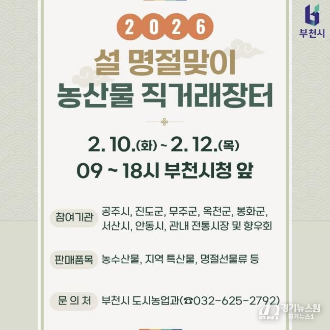 [경기뉴스원/경기뉴스1] | 부천시는 설 명절을 앞두고 2월 10일부터 12일까지 시청 정문 앞에서 ‘2026년 설 명절맞이 농산물 직거래장터’를 연다.