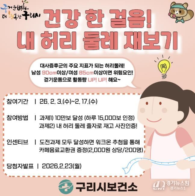 [경기뉴스원/경기뉴스1] | 구리시는 시민의 대사증후군 예방과 건강 인식 제고를 위해 ‘건강 한 걸음! 내 허리둘레 재보기’ 챌린지를 2월 3일부터 2월 17일까지 15일간 운영한다고 밝혔다.