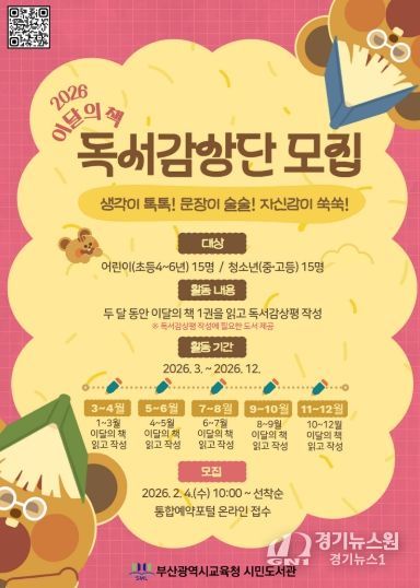 [경기뉴스원/경기뉴스1] | 부산광역시립시민도서관(관장 이은경)은 오는 3월부터 12월까지 초·중·고 학생 30명을 대상으로 ‘이달의 책 독서감상단’을 운영한다.