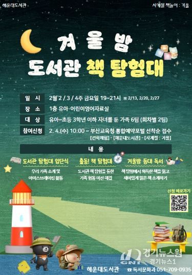 [경기뉴스원/경기뉴스1] | 부산광역시립해운대도서관(관장 노장석)은 오는 13일부터 27일까지 2·3·4주 금요일 저녁마다 도서관 유아·어린이 영어 자료실에서 유아와 초등 저학년 자녀를 둔 가족 6팀을 대상으로 ‘겨울밤 도서관 책 탐험대’ 프로그램을 운영한다.