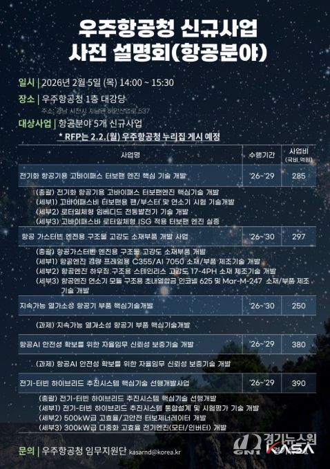 [경기뉴스원/경기뉴스1] | 우주항공청은 2월 5일 오후 2시, 사천 우주항공청 1층 대강당에서 2026년 항공분야 신규사업의 주요 내용을 공유하고, 산·학·연 연구자의 적극적인 참여와 심도 있는 이해를 돕기 위한 사전설명회를 개최한다고 밝혔다.