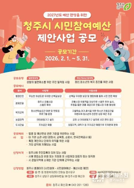 [경기뉴스원/경기뉴스1] | 청주시는 2027년 예산편성을 위한 시민참여예산 제안사업 공모를 오는 5월 31일까지 접수한다고 4일 밝혔다.