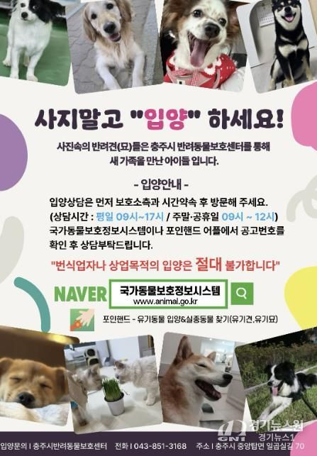 [경기뉴스원/경기뉴스1] | 충주시는 반려동물보호센터에서 보호 중인 유실·유기동물의 장기체류와 안락사를 예방하고 입양을 활성화하기 위해 ‘입양비 지원사업’을 실시한다고 4일 밝혔다.