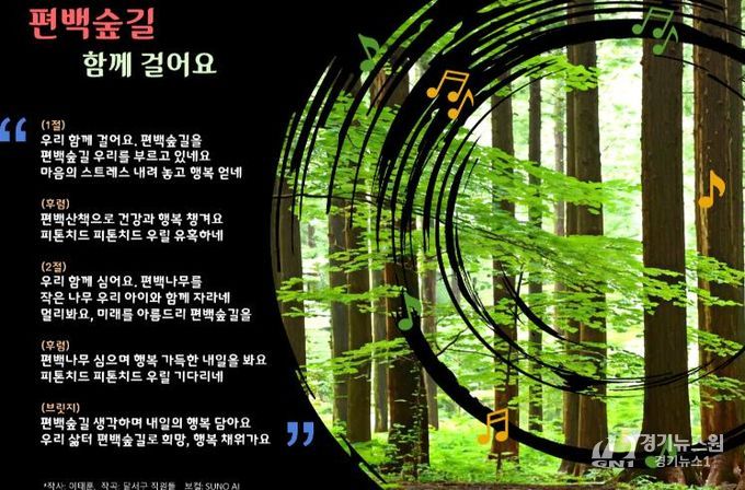 노래 '편백숲길 함께 걸어요'는 ‘우리 함께 걸어요 편백숲길을’, ‘편백나무 우리 아이와 함께 자라네’라는 가사를 통해 구민이 함께 걷고, 심고, 키워가는 공동체의 미래를 따뜻하게 표현했다.