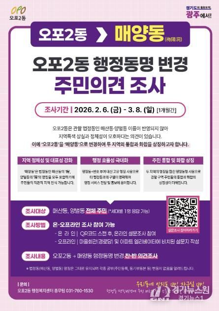 [경기뉴스원/경기뉴스1] | 광주시 오포2동은 지역 정체성을 반영한 행정동 명칭 변경을 위해 2월 6일부터 3월 8일까지 오포2동 전 세대를 대상으로 주민 의견 조사를 실시한다고 4일 밝혔다.