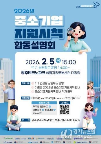 4일 북구에 따르면 오는 5일 오후 3시 광주테크노파크 생활지원로봇센터 대강당에서 ‘2026년 중소기업 지원시책 합동설명회’가 개최된다.
