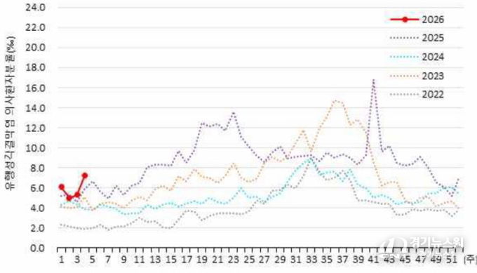 질병관리청 표본감시 자료에 따르면, 1월 넷째 주 유행성결막염 의사환자 분율은 인구 1,000명당 7.2명으로 집계됐다. 이는 전주(5.3명)보다 증가한 수치로, 2022년부터 2025년까지 최근 4년간 같은 기간과 비교해도 가장 높은 수준이다.