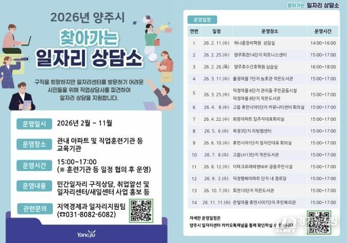 [경기뉴스원/경기뉴스1] | 양주시가 구직 현장의 문턱을 낮추고 시민들의 취업 성공률을 높이기 위해 오는 11월까지 ‘2026년 찾아가는 일자리 상담소' 를 운영한다.