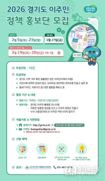 [경기뉴스원/경기뉴스1] | 경기도이민사회통합지원센터에서 오는 23일까지 ‘2026 경기도 이주민 정책 홍보단’ 15명을 모집한다.