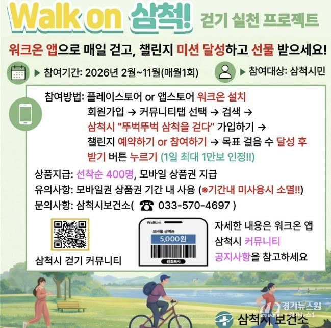 [경기뉴스원/경기뉴스1] | 삼척시는 시민들의 건강 증진과 일상 속 걷기 실천율 향상을 위해 모바일 걷기 앱 '워크온(Walk On)'을 활용한 ‘워크온 걷기 챌린지’를 오는 2월부터 11월까지 운영한다.