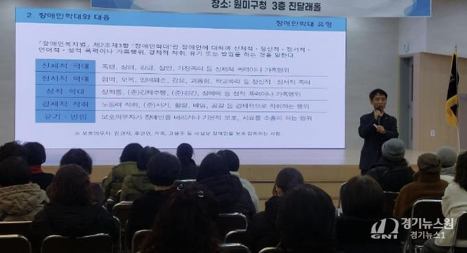 [경기뉴스원/경기뉴스1] | 부천시는 지난 3일 부천시장애인인권센터와 함께 원미구청 진달래홀에서 ㈜햇빛나눔 소속 활동지원사 200여 명을 대상으로 ‘장애인활동지원사와 장애인 인권’을 주제로 교육을 실시했다.