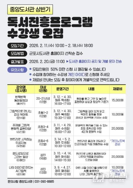 [경기뉴스원/경기뉴스1] | 군포시 중앙도서관은 다가오는 3월 시민들의 독서역량 개발과 지속적인 독서활동을 고취하기 위해 상반기 독서진흥프로그램을 운영한다.