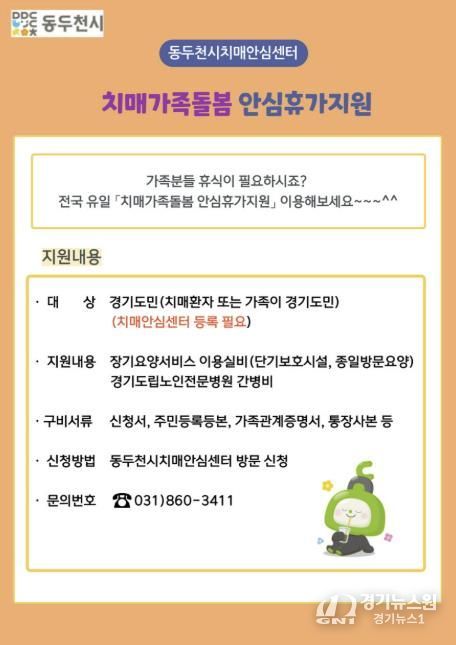 [경기뉴스원/경기뉴스1] | 동두천시치매안심센터는 경기도에서 전국 유일로 시행 중인 '치매가족돌봄 안심휴가 지원사업'을 적극 홍보하고, 치매 환자 가족의 돌봄 부담 완화와 휴식 보장을 위해 사업 안내에 나섰다.