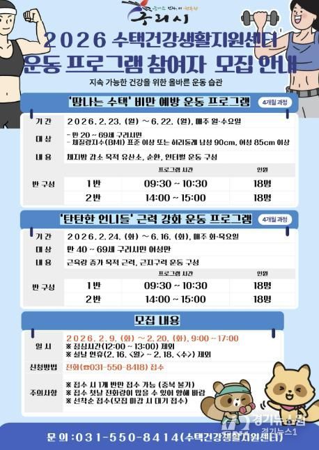[경기뉴스원/경기뉴스1] | 구리시 수택건강생활지원센터는 오는 2월 9일부터 성인과 중장년층의 비만 예방과 근력 강화를 위한 맞춤형 운동프로그램인 ‘땀나는 수택’과 ‘탄탄한 언니들’의 참여자를 모집한다고 밝혔다.