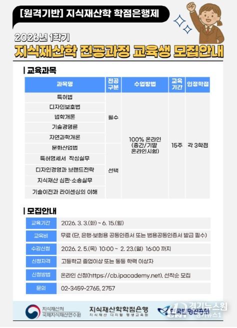 [경기뉴스원/경기뉴스1] | 지식재산처 국제지식재산연수원은 한국발명진흥회와 공동으로 2월 5일부터 23일까지 지식재산학 학점은행 과정에 대한 온라인 수강생을 모집한다.