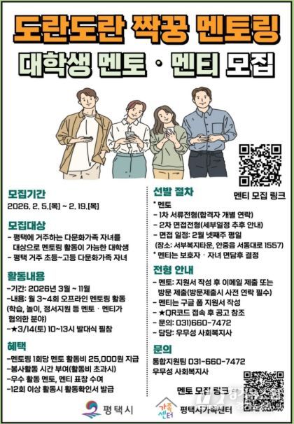 [경기뉴스원/경기뉴스1] | 평택시가족센터는 2월 5일부터 19일까지 다문화가족 자녀 대상 ‘도란도란 짝꿍 멘토링’에 참여할 대학생 멘토와 멘티를 모집한다.