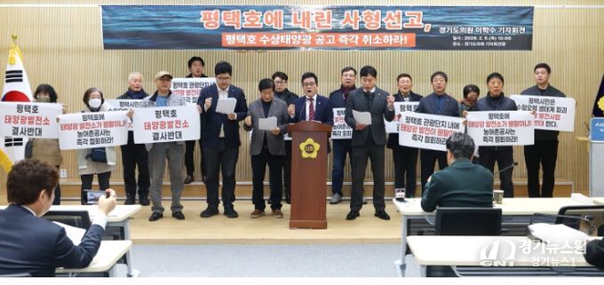 [경기뉴스원/경기뉴스1] | 경기도의회 이학수 의원(국민의힘, 평택5)은 5일(목) 경기도의회 기자회견장에서 기자회견을 열고 한국농어촌공사가 발표한 평택호 수상태양광 사업 공고의 즉각적인 취소를 강력히 요구했다.