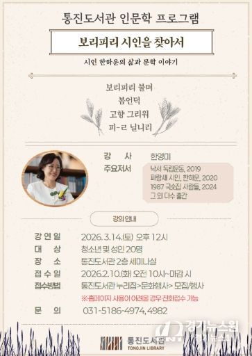 [경기뉴스원/경기뉴스1] | 김포시 통진도서관은 한하운 시인의 삶과 문학을 다룬 인문학 프로그램 ‘보리피리 시인을 찾아서’를 오는 3월 14일 오후 12시부터 통진도서관 세미나실에서 운영한다.
