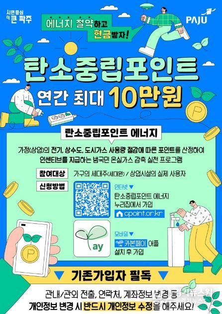 [경기뉴스원/경기뉴스1] | 파주시는 생활 속 탄소중립 실천을 통한 온실가스 감축을 위해 탄소중립포인트제 에너지 분야 신규 참여자를 연중 상시 모집한다.