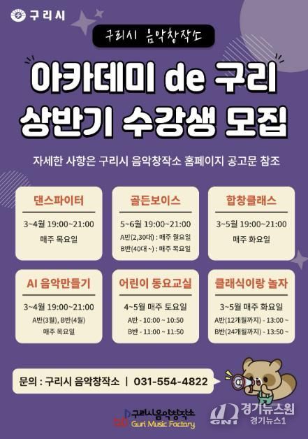 [경기뉴스원/경기뉴스1] | 구리시는 잠재적 예술인 양성을 위해 구리시 음악창작소에서 운영하는 '2026 상반기 아카데미 de’구리'의 수강생을 2월 2일부터 모집하고 있다고 밝혔다.
