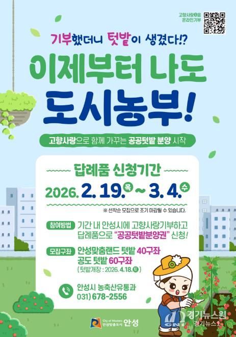 [경기뉴스원/경기뉴스1] | 안성시는 오는 2월 19일부터 고향사랑기부제를 통해 도시농업을 체험하는 ‘도시농부’를 모집한다고 밝혔다.