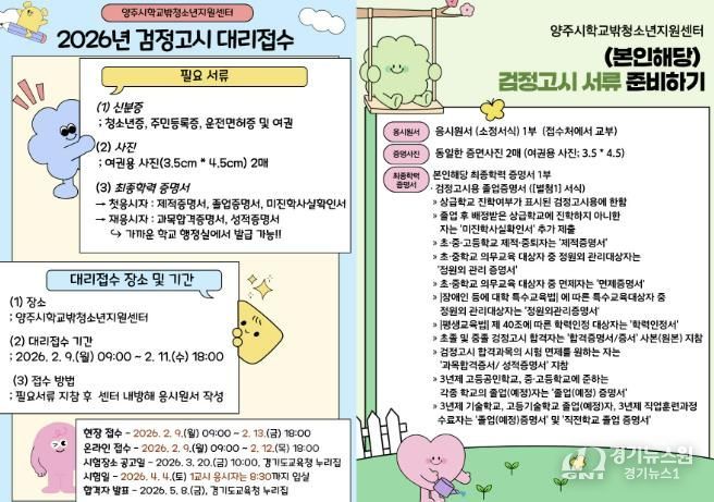 [경기뉴스원/경기뉴스1] | 양주시학교밖청소년지원센터에서는 학교 밖 청소년들을 위해 2026년 제1회 초중고 졸업 학력 검정고시 응시 원서 접수 대행을 지원한다.