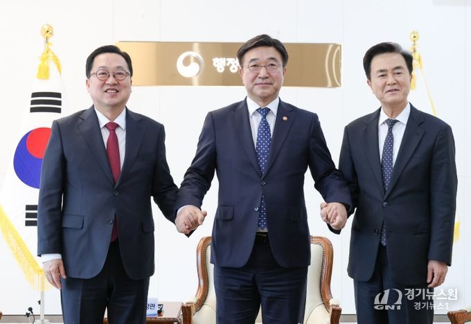[경기뉴스원/경기뉴스1] | 이장우 대전시장은 6일 오후 4시 정부세종청사에서 윤호중 행안부 장관, 김태흠 충남지사와 간담회를 갖고, 대전․충남 행정통합 특별법의 원안 관철을 정부에 촉구하며 관련 건의문을 공식 전달했다.