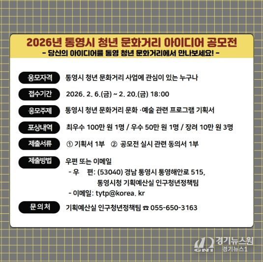 [경기뉴스원/경기뉴스1] | 통영시는 '청년 365 핫플레이스 조성사업'과 연계한 청년 문화·예술 프로그램을 발굴하기 위해 ‘2026년 통영시 청년 문화거리 아이디어 공모전’을 개최한다고 9일 밝혔다.