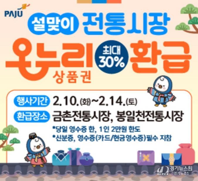 [경기뉴스원/경기뉴스1] | 파주시는 2026년 설 명절을 맞아 고물가로 인한 시민들의 가계 부담을 덜고 지역 전통시장 활성화를 도모하기 위해 ‘설맞이 농축산물 온누리상품권 환급 행사’를 실시한다.