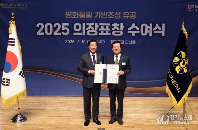[경기뉴스원/경기뉴스1] | 이상복 오산시의회 의장이 10일 경기도청 다산홀에서 ‘2025년 평화통일 기반 조성 유공 표창’을 받았다.