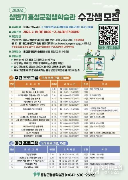 [경기뉴스원/경기뉴스1] | 우수 평생학습도시 홍성군이 유아부터 노년까지 전 생애를 아우르는 학습 기회를 제공하기 위해 오는 19일부터 24일까지 6일간 홍성군평생학습관과 신도시평생학습관에서 상반기 프로그램 수강생을 모집한다.