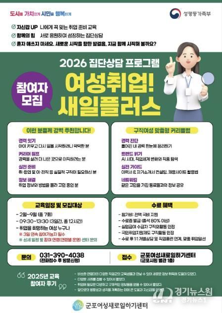 [경기뉴스원/경기뉴스1] | 군포여성새로일하기센터(군포시청 별관 1층)는 지역 내 여성들의 성공적인 사회 진출과 경력 이음을 돕기 위해 ‘2026년 집단상담 프로그램: 여성취업! 새일플러스’ 참여자를 모집한다고 밝혔다.