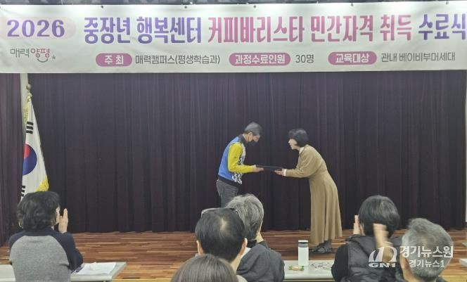 [경기뉴스원/경기뉴스1] | 양평군은 지난 11일 군민을 대상으로 운영한 ‘2026년 양평군 커피바리스타 신규 양성과정’을 3주간의 교육 일정을 마무리하고 수료식을 개최했다고 밝혔다. 이번 과정은 관내 베이비부머 세대의 역량 강화를 통해 사회 공헌과 재취업 기회를 제공하기 위해 기획·운영됐다.