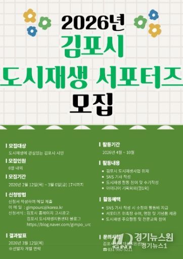 [경기뉴스원/경기뉴스1] | 김포시는 다양한 도시재생사업을 홍보하고 도시재생에 대한 시민들의 이해와 관심을 도모하고자 오는 12일부터 ‘2026년 김포시 도시재생 서포터즈’를 모집한다.
