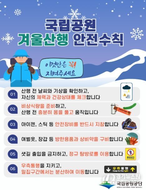 [경기뉴스원/경기뉴스1] | 기후에너지환경부 산하 국립공원공단(이사장 주대영)은 2월 14일부터 18일까지 설 연휴 탐방객 안전관리 대책 기간으로 지정하고, 국립공원 주요 지역 1,544곳에 인력 4,833명을 집중 배치해 탐방객의 생명과 안전을 지키기 위한 현장 대응을 대폭 강화한다고 밝혔다.