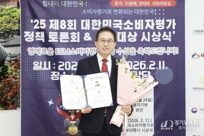 [경기뉴스원/경기뉴스1] | 지난 11일, 국회 도서관에서 열린 2026 제8회 ESM대한민국소비자평가우수대상 정책토론회 및 시상식에서 광주시의회 허경행 의장이 지방자치/행정 부문 대상을 수상했다.