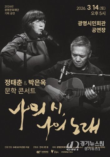 [경기뉴스원/경기뉴스1] | (재)광명문화재단은 오는 3월 14일 오후 5시 광명시민회관 공연장에서 한국 포크 음악을 대표하는 정태춘·박은옥의 문학 콘서트 '나의 시, 나의 노래'를 개최한다.