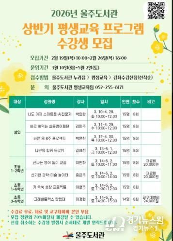 [경기뉴스원/경기뉴스1] | 울산 울주도서관은 19일부터 26일까지 초등학생과 지역 주민을 대상으로 ‘상반기 평생교육 프로그램’ 수강생 119명을 선착순으로 모집한다.