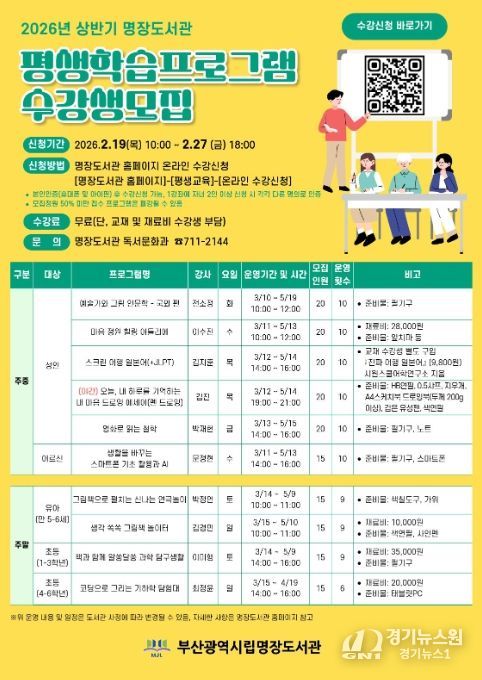 [경기뉴스원/경기뉴스1] | 부산시교육청 명장도서관은 3월부터 5월까지 명장도서관에서 유아, 초등학생, 성인 등 175명을 대상으로 ‘2026 상반기 평생학습 프로그램’을 운영한다.