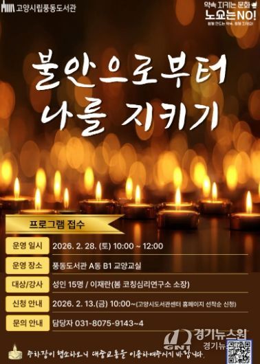 [경기뉴스원/경기뉴스1] | 고양특례시 풍동도서관은 오는 2월 28일 오전 10시부터 12시까지 풍동도서관 A동 지하 1층 교양교실에서 공공도서관 독서문화 프로그램 ‘불안으로부터 나를 지키기’를 운영한다.