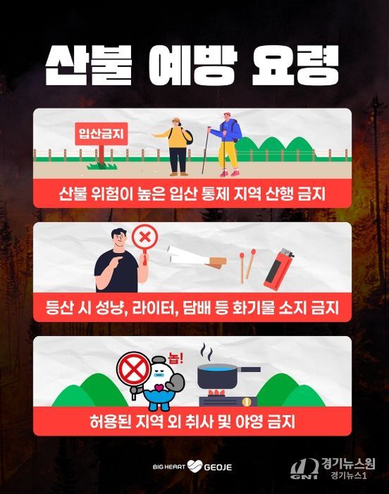 최경호 거제시 산림과장은 “설 연휴 기간은 산불 발생 위험이 매우 높은 시기인 만큼 시민 여러분께서도 산림 인접지역 소각 금지 등 산불 예방 수칙을 반드시 준수해 주시기를 당부드린다”며 “거제시는 산불 예방과 신속 대응을 위해 행정력을 집중하겠다”고 말했다.