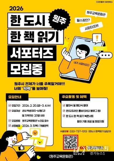 [경기뉴스원/경기뉴스1] | 강원특별자치도교육청원주교육문화관은 지역 독서 문화 확산과 시민 참여 확대를 위해 ‘2026년 원주 한 도시 한 책 읽기 서포터즈’를 운영한다.