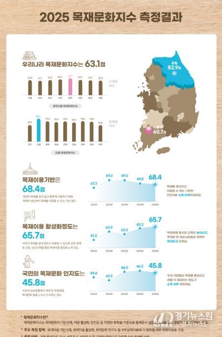 [경기뉴스원/경기뉴스1] | 산림청은 전국 17개 광역시·도를 대상으로 목재문화 정착 및 진흥 수준을 평가한 ‘2025년 목재문화지수’ 결과를 30일 발표했다. 이 지수는 지역별 목재이용기반구축, 활성화, 목재문화 인지도 세 지표를 종합 평가한다.