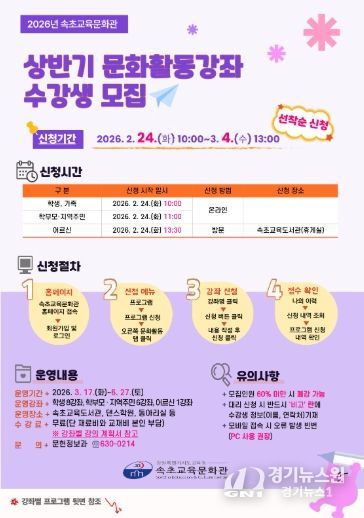 [경기뉴스원/경기뉴스1] | 속초교육문화관은 3월부터 6월까지 지역 주민의 다양한 학습 수용에 부응하고 배움과 자기계발의 기회를 제공하기 위해 ‘2026년 상반기 문화활동강좌’를 운영한다.