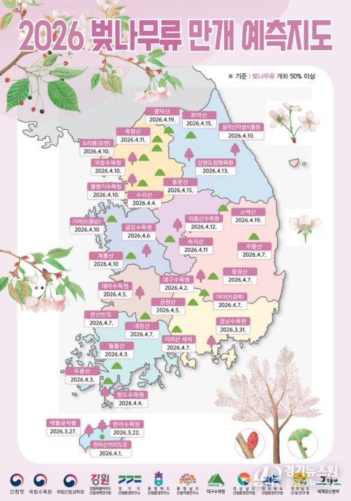 [경기뉴스원/경기뉴스1] | 산림청은 봄철 생강나무, 진달래, 벚나무류의 개화 시기를 담은 ‘2026년 봄철 꽃나무 개화 예측지도’를 발표하며, 올 봄철(3~4월) 기온이 평년보다 높을 것으로 전망돼 개화 시기가 지난해보다 다소 앞당겨질 것으로 예상된다고 24일 밝혔다.